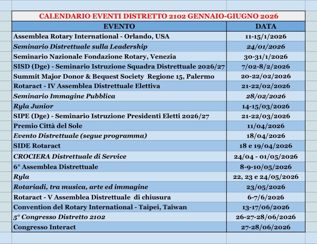 Il Distretto 2102 si prepara a vivere un 2026 intenso e ricco di appuntamenti, con iniziative che abbracciano formazione, service, amicizia e crescita rotariana.