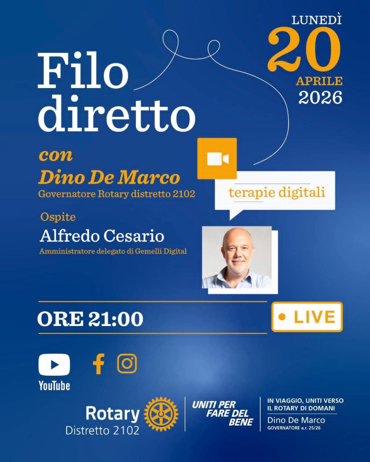 Lunedì 20 aprile 2026, alle ore 21:00, l’appuntamento vedrà la partecipazione di Alfredo Cesario, Amministratore Delegato di Gemelli Digital, ospite del Governatore Dino De Marco.