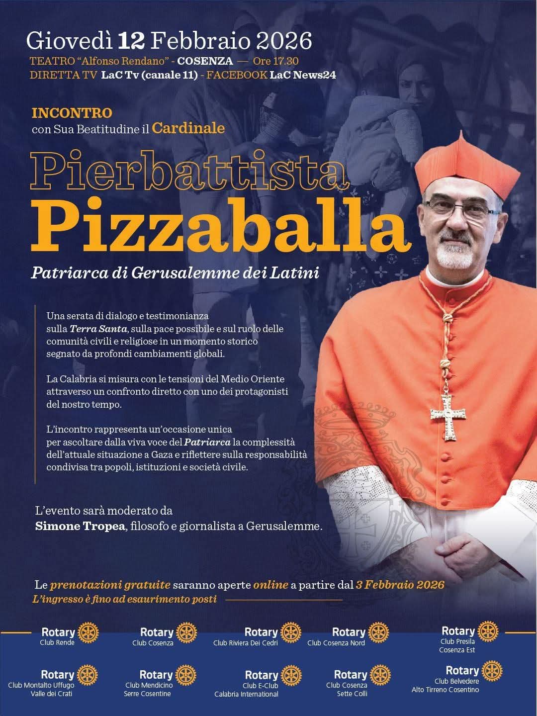 Dopo i saluti del Sindaco di Cosenza, Franz Caruso che ha ringraziato il Cardinale Pizzaballa per la sua presenza giunta nel giorno in cui si festeggia la Madonna del Pilerio, patrona della Città, il Presidente del Rotary Rende, Sergio Mazzuca, ha evidenziato come:” L’iniziativa aveva uno scopo chiaro e unico: trasformare un incontro in un aiuto concreto, quanto raccolto in favore dei bambini di Gaza, rappresenta il risultato più vero e più importante di questo cammino comune. Non è solo una cifra: è un gesto collettivo di solidarietà, responsabilità e umanità che ha visto lavorare insieme e sinergicamente i rotariani di molti club, uniti dalla volontà di fare qualcosa di concreto e, soprattutto, di lanciare un messaggio di solidarietà da una terra piena di problemi ma anche di eccellenze che sa essere solidale e unita quando c’è da aiutare il prossimo. La nostra comunità, nella sua umiltà, ha scelto di non chiudersi, di non essere indifferente rispetto al resto del mondo e di non considerare lontano un dolore che, per tanti motivi, è